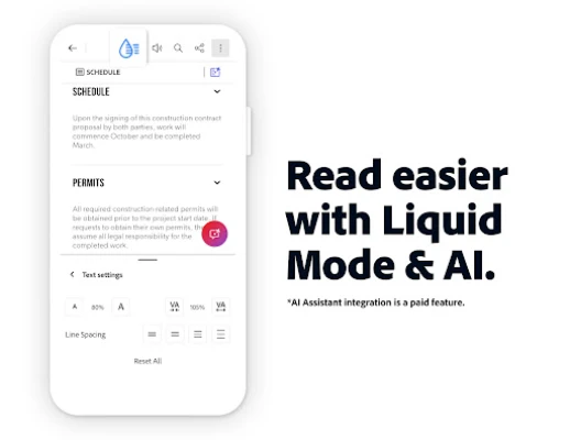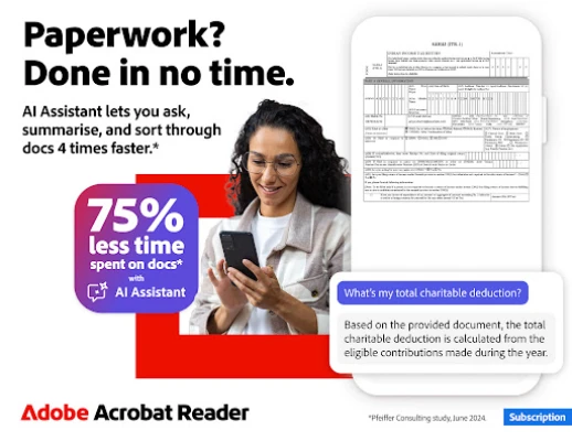 Adobe Acrobat Reader-ன் சந்தா மூலம் பிரத்தியேகமான மற்றும் மேம்பட்ட அம்சங்களை அணுகலாம். Adobe Acrobat AI Assistant, உங்கள் பல கோப்புகளுக்கிடையே எளிதாகச் செயல்படவும், கேள்வி பதில் உரையாடல்களை நிகழ்த்தவும் உதவுகிறது. குரல் அல்லது உரை கட்டளைகள் மூலம் கேள்வி கேட்டு, ஆவணங்களில் உள்ள விளக்கப்படங்கள், வரைபடங்கள் மற்றும் அட்டவணைகள் உட்பட எந்தவொரு விவரங்கள் குறித்தும் துல்லியமான, மேற்கோள் காட்டப்பட்ட பதில்களைப் பெறலாம். உடனடி சுருக்கங்கள் உருவாக்கி, மின்னஞ்சல்கள், குறிப்புகள் அல்லது வலைப்பதிவுகளுக்கான உள்ளடக்கத்தை உருவாக்கலாம். மொபைலில், PDF எடிட்டர் மூலம் நேரடியாக உரை மற்றும் படங்களைத் திருத்தலாம், எழுத்து பிழைகளைச் சரிசெய்யலாம் அல்லது பத்திகளைச் சேர்க்கலாம். OCR தொழில்நுட்பம் ஸ்கேன் செய்யப்பட்ட ஆவணங்களை தேடக்கூடிய, திருத்தக்கூடிய உரையாக மாற்றுகிறது. பல PDF கோப்புகளை ஒன்றிணைக்க, பிரிக்க, செருக, நீக்க அல்லது பக்கங்களை ஒழுங்கமைக்கவும் முடியும். எந்தக் கோப்பு வகையையும் PDF ஆக மாற்றவும், PDF-களை Word, Excel, PowerPoint அல்லது படக் கோப்புகளாக ஏற்றுமதி செய்யவும் Adobe Acrobat Reader துணைபுரிகிறது. உங்கள் கோப்புகளைச் சுருக்கி, கடவுச்சொல் மூலம் பாதுகாத்து, பயணத்தின்போது சத்தமாக வாசிக்கவும் செய்யலாம்.