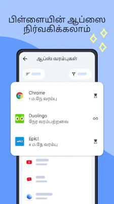 சிறுவர்களின் டிஜிட்டல் உலகை நிர்வகிப்பது இன்றைய பெற்றோர்களுக்கு ஒரு தனித்துவமான சவாலானது. இந்தச் சவாலை எளிதாக்கி, அவர்களுக்குச் சிறந்த டிஜிட்டல் அனுபவத்தை வழங்கவே Family Link உருவாக்கப்பட்டுள்ளது. உங்கள் குழந்தைகளின் திரைப் பயன்பாட்டைச் சமநிலைப்படுத்த இது ஒரு அற்புதமான வழியை வழங்குகிறது. தினசரி வரம்புகள் மற்றும் பள்ளி, ஓய்வு நேரங்களுக்கான அட்டவணைகளை அமைப்பதன் மூலம், அவர்களுக்குப் பாதுகாப்பான மற்றும் பயனுள்ள டிஜிட்டல் சூழலை நீங்கள் உருவாக்கலாம். ஒவ்வொரு செயலிக்கும் தனிப்பட்ட நேர வரம்புகளை நிர்ணயிக்கும் வசதி உள்ளது. கல்வி சார்ந்த அல்லது அத்தியாவசியமான செயலிகளுக்கு வரம்பற்ற அணுகலை வழங்கவும், தேவைப்பட்டால் தேவையற்ற செயலிகளைத் தடுக்கவும் Family Link உதவுகிறது.