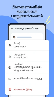 ஆன்லைன் பாதுகாப்பிற்கு Family Link முன்னுரிமை அளிக்கிறது. கூகிள் க்ரோம், கூகிள் ப்ளே, யூடியூப் மற்றும் தேடல் போன்ற கூகிள் சேவைகளில் உங்கள் குழந்தை எதைப் பார்க்கிறது என்பதை நீங்கள் திறம்படக் கட்டுப்படுத்தலாம். பொருத்தமற்ற இணையதளங்களைத் தடை செய்வது, புதிய செயலிகளை நிறுவ அனுமதியைக் கேட்பது, செயலிகள் மற்றும் இணையதளங்களுக்கான அணுகல் அனுமதிகளை நிர்வகிப்பது என பல பாதுகாப்பு அம்சங்களை இது ஒருங்கிணைக்கிறது. மேலும், அவர்களின் கணக்கு மற்றும் தனியுரிமை அமைப்புகளைப் பாதுகாக்க Family Link ஒரு முக்கிய கருவியாக செயல்படுகிறது. பெற்றோராக, கடவுச்சொல்லை மறந்துவிட்டாலோ, தனிப்பட்ட தகவல்களைத் திருத்த வேண்டியிருந்தாலோ, அல்லது கணக்கையே நீக்க வேண்டிய நிலை வந்தாலோ நீங்கள் அவர்களுக்கு உதவ முடியும்.