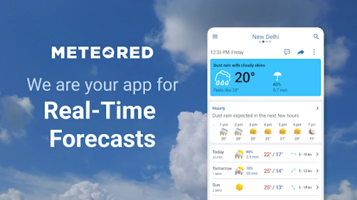 Meteored இந்தியாவின் துல்லியமான வானிலை முன்னறிவிப்புகள், எச்சரிக்கைகள் மற்றும் நேரடி ரேடாரை வழங்குகிறது. உலகத் தரமான கணிப்பு மாதிரி மற்றும் நவீன வடிவமைப்புடன், விரிவான உள்ளூர் வானிலை அறிக்கைகள், மழை, புயல் விவரங்கள் மற்றும் 14 நாள் முன்னறிவிப்பை உடனுக்குடன் பெறுங்கள். வானிலை உங்களை ஒருபோதும் ஆச்சரியப்படுத்தாது.