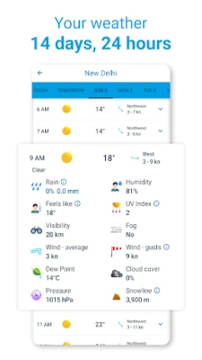 தற்போதைய வானிலை நிலைமைகளையும், அடுத்த 14 நாட்களுக்கான விரிவான முன்னறிவிப்புகளையும் கண்டறியவும். ஒவ்வொரு நாளையும் தொடுவதன் மூலம், காற்று அழுத்தம், வெப்பநிலை, காற்றின் திசை மற்றும் வேகம், பனிப்பொழிவு, மழைப்பொழிவுக்கான வாய்ப்பு, உண்மையான வெப்பநிலை உணர்வு, ஈரப்பதம், புறஊதாக் குறியீடு, சூரிய உதயம் மற்றும் மறைவு நேரம், சந்திரனின் நிலைகள் போன்ற துல்லியமான மணிநேரத் தரவுகளை நீங்கள் பெறலாம். உங்கள் பகுதியில் காற்றின் தரம் அல்லது மகரந்த அளவையும் சரிபார்க்கலாம். உங்கள் ஃபோனைத் திருப்புவதன் மூலம், எங்கள் விளக்கப்படங்கள் மூலம் வெப்பநிலையின் போக்கைக் கண்காணிக்கலாம்.